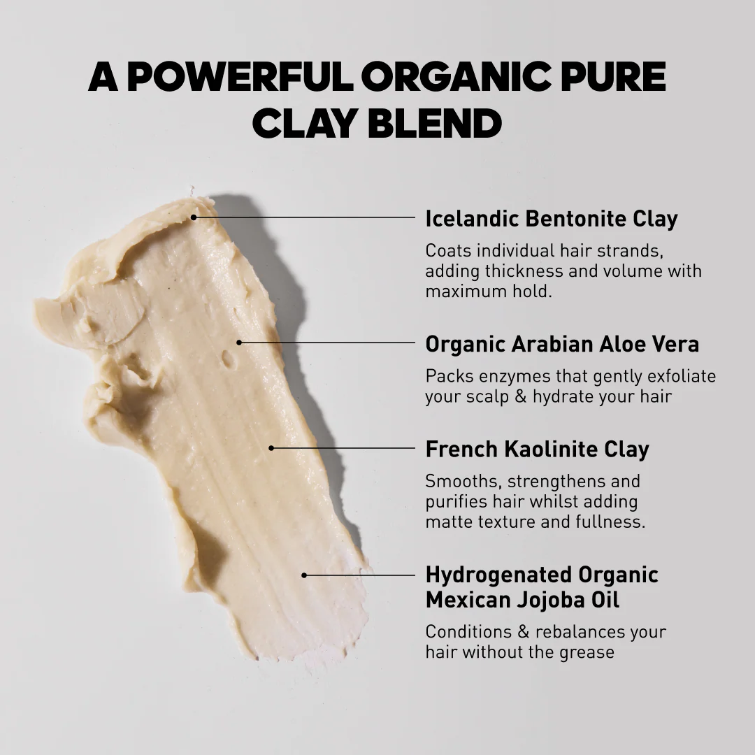 Icelandic Bentonite clay. Mined from the earth and formed from rare volcanic ash, this fine ingredient spreads easily through hair, adding thickness and volume to individual hair strands with maximum hold.